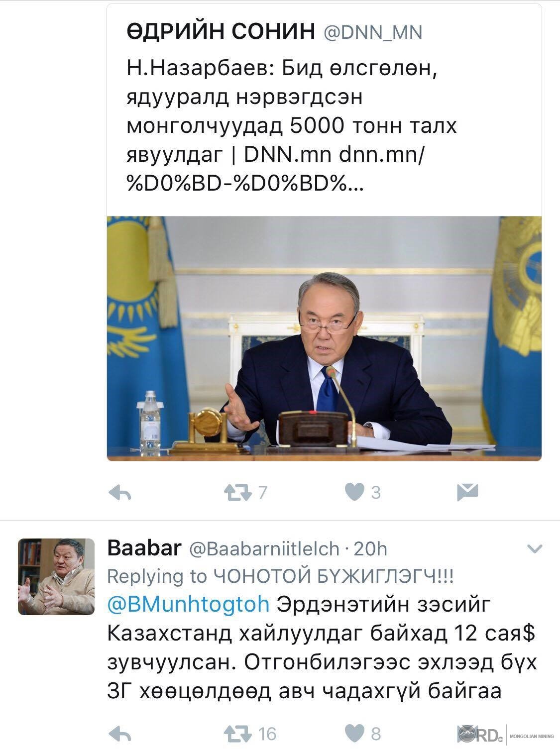 Юу гэвэл ерээд оны үед Эрдэнэт УБҮ-ээс Казакстан улсад 12 сая амдолларын зэсийн баяжмал нийлүүлж, өнөөг хүртэл нэг ч ам.доллар авч чадаагүй байгаа юм. Тухайн үед Н.Багабанди Ерөнхийлөгч энэхүү баяжмалын төлбөр тооцооны асуудлыг сануулахад Н.Назарбаевын өгсөн хариу ийм байсан аж.