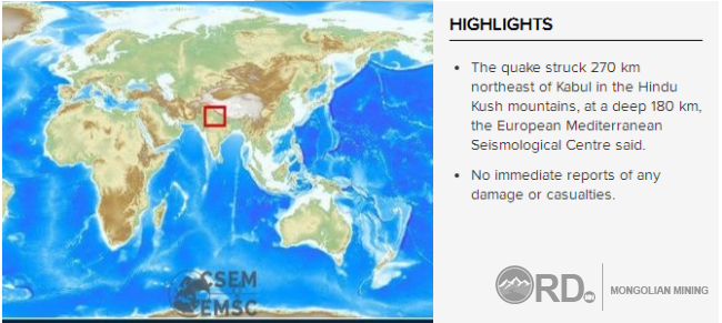 1-р сарын 31-нд Афганистаны хойд биеийн Хиндү Куш бүсэд 6.1 баллын хүчтэй газар хөдөлж, нийслэл Кабулд мэдэгдэм чичирхийлэл үүссэн байна. Өнөөгийн байдлаар, хүний амь үрэгдсэн, шархдсан, эд хөрөнгө сүйдсэн тухай мэдээлэл хараахан гараагүй байна.