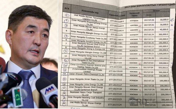 "Эрдэнэс Тавантолгой” ХК дээрх мэдэгдлээ зөрчиж маш олон удаа, онц их хэмжээний нүүрсийг "нууц гэрээ"-гээр Хятадын компаниудад өгсөн байна. Зарим гэрээний жагсаалтыг зураг дээрээс харна уу. Зөвхөн энэ хуудас дээрх жагсаалтад 5-7 дугаар сард буюу Монгол Улсын Ерөнхийлөгчийн 2017 оны ээлжит сонгууль, Үндэсний их баяр наадам дамнуулан байгуулсан гэрээ байна. Үүнээс гадна олон бий гэсэн үг. Маш ноцтой нэг зүйл яригдаж байгаа нь ийм гэрээ байгуулаад коксжих нүүрсний тонн тутмаас 2.0 ам.доллар, исэлдсэн нүүрсний тонн тутмаас 1.0 ам.доллар "нүүрсчид”-ийн халаасанд ордог байсан байж тун болзошгүй ажээ. Хуудас дээрх жагсаалтад 1 250 000 тонн исэлдсэн нүүрсний гэрээ байна. Исэлдсэн нүүрсний тонн тутмаас 1.0 ам.долларыг халаасладаг гэвэл 1 250 000 нэг сая хоёр зуун тавин мянган ам.доллар болно. Мөн энэ хуудсан дахь гэрээгээр 3 510 000 тонн коксжих нүүрсийг олборлуулжээ. Коксжих нүүрний тонн тутмаас 2.0 ам.доллар халаасладаг гэвэл 7 020 000 долоон сая хорин мянган ам.доллар "нүүрсчид”-ийн халаасанд орсон болж таарах нээ. Нийлээд 8 270 000 найман сая хоёр дуун далан мянган ам.доллар болж байна.