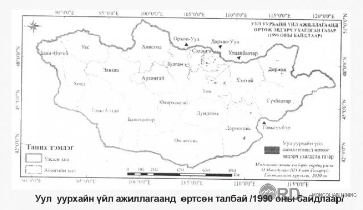 Энэхүү судалгаагаар Монгол Улс зах зээлийн нийгэмд шилжсэн 1990 оноос 2019 он хүртэл гуравхан арван жилийн хугацаанд хэдий хэмжээний газар нутгийг ухаж, сүйтгэснийг тодруулахыг зорилоо. Судалгаанд Монгол орны нийт нутаг дэвсгэрийг хамарсан 30 метрийн орон зайн нарийвчлалтай 1990 оны (±1 интервалтай) Ландсат 05, 2019 оны (±1 интервалтай) Ландсат 08 хиймэл дагуулын мэдээг тус тус ашигласан [1]. Судалгааны үр дүнгээс үзэхэд 1990 оны байдлаар 15 аймгийн 42 сумын 153 газрын нийт 26124.8 га талбай уул уурхайн үйл ажиллагаанд өртсөн бол (Зураг 1) 2019 оны байдлаар 21 аймгийн 140 сумын 1070 газрын нийт 167678.1 га талбай (Зураг 2) уул уурхайн үйл ажиллагаанд өртөж байгалийн унаган төрхөө алдсан байна. Өөрөөр хэлбэл, гуравхан 10 жилийн хугацаанд шинээр 98 сумын 917 газарт уул уурхайн үйл ажиллагаа явуулж 141 153.3 га газар нутаг ухсан нүх овоолсон шороо болон үлджээ. Үүнийг 1990 онтой харьцуулж үзэхэд уул уурхайн үйл ажиллагаанд өртсөн сумдын тоо 3.3 дахин, газрын тоо 7.0 дахин, талбайн хэмжээ 6.4 дахин тус тус нэмэгдсэн байна. Уул уурхайн үйл ажиллагаанд өртсөн талбайг улс, аймаг, сумын нийт талбайд харьцуулж үзэхэд өчүүхэн бага тоо гардаг хэдий ч сав шим ертөнцөд үзүүлж буй хор хөнөөл нь бидний амьдралын чанарт шууд болон дам байдлаар нөлөөлж эхлэх үед л бидний ухамсарт дохио өгч эхэлдэг. 2019 оны байдлаар уул уурхайн үйл ажиллагааны нөлөөгөөр хамгийн их газар нутгийг сүйтгэсэн аймаг нь Өмнөговь, хамгийн бага нь Говьсүмбэр аймаг байна.
