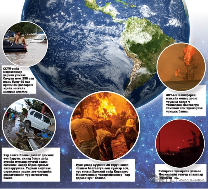 Дэлхий нийтээрээ цар тахалд санаагаа чилээн, бүх анхаарлаа халдварыг дарахад хандуулсан байх энэ үеэр ч байгалийн гамшиг биднийг "өршөөсөнгүй”. Их хэмжээний үер, өргөн хүрээг хамарсан түймэр, цочир халуун, хар салхи гэсэн байгалийн гамшиг дэлхийг зовоож эхлээд удлаа. Тодруулбал, ОХУ, АНУ, Итали, Турк, Канад, Грек улсуудыг ойн түймэр "нөмөрч”, хэдэн сая га талбай шатаж, олон мянган хүн амиа алдахаас гадна өөр нутаг руу дүрвэсэн бол өчнөөн мянган амьтан хохироод байна. Мөн Хятад, Японд үерийн аюул нүүрлээд байна. Эдгээр мэдээллийг тоймлон хүргэе.